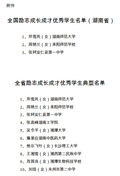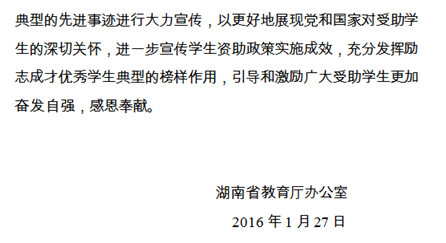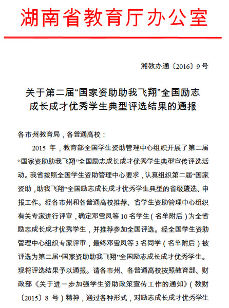 2015年秋季,教育部全国学生资助管理中心组织开展了第二届“国家资助,助我飞翔”全国励志成长成才优秀学生典型宣传评选活动中,全省所有普通高校和各市州普通高中和中等职业学校参加了此次活动。我校学生工作处按照要求,认真组织申报和遴选工作,经过资格审查、初选、网上投票,共评出21名同学,分别获评诚信自强之星和诚信自强之星提名,经研究,我校向省教育厅推报了其中的詹家仪同学。经过教育厅评审,詹家仪同学被评选为全省立志成长成才优秀学生典型。