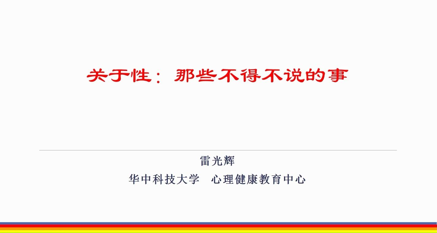 为了普及性心理知识,提高性健康意识,我校学生工作部(处)特邀请华中科技大学大学生心理健康教育中心副主任,专职心理咨询师,中国性学会性心理专委会委员,湖北省心理健康教育与咨询研究会副秘书长,湖北省心理学会团体心理辅导与治疗专业委员会委员,湖北省婚姻家庭研究会青少年心理专委会副主任雷光辉老师,为全体师生带来“关于性:那些不得不说的事”线上青春健康教育专题讲座。