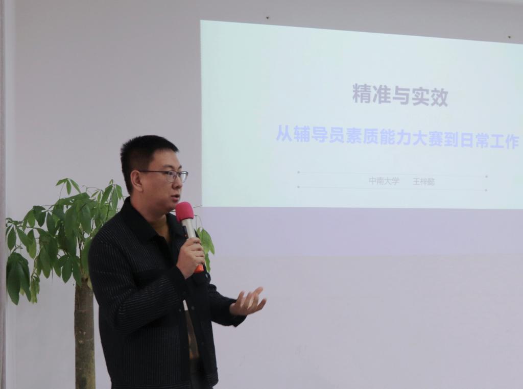 王梓懿老师认为“工作展示、示范引领”是辅导员素质能力大赛目前的趋势,参与比赛有助于辅导员总结工作经验,凝练工作成果,科学性专业化地开展下一步工作。针对比赛的各个环节经验,他运用生动案例倾囊而授:在理论宣讲的准备上,要把握“一条主线,两个维度,三个核心”;案例研讨则需“合作”与“博弈”并举;谈心谈话要以“探讨”与“引领”为抓手。他指出辅导员素质能力大赛是辅导员快速成长的通道,通过比赛,辅导员在政治性、理论性、专业性和职业性上获得积淀和成长,最终完成从事务型辅导员向研究型辅导员的角色转变,实现素质能力、工作格局、职业理想信念上的“跃升”。