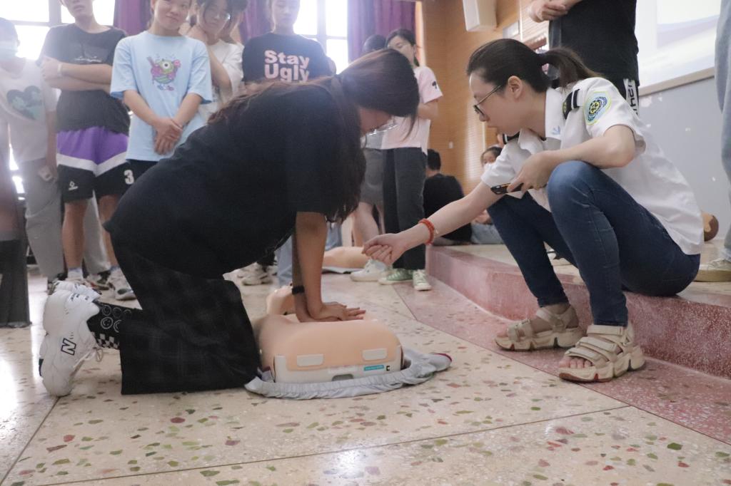 此次培训由长沙市120急救中心授课,采用“理论+实践”模式,针对心跳停止、中暑、溺水等生活中的急救场景一一讲解,并对心肺复苏术、海姆立克急救法和AED的使用进行实际指导。经考核,194名同伴学长取得“第一目击者”证书。